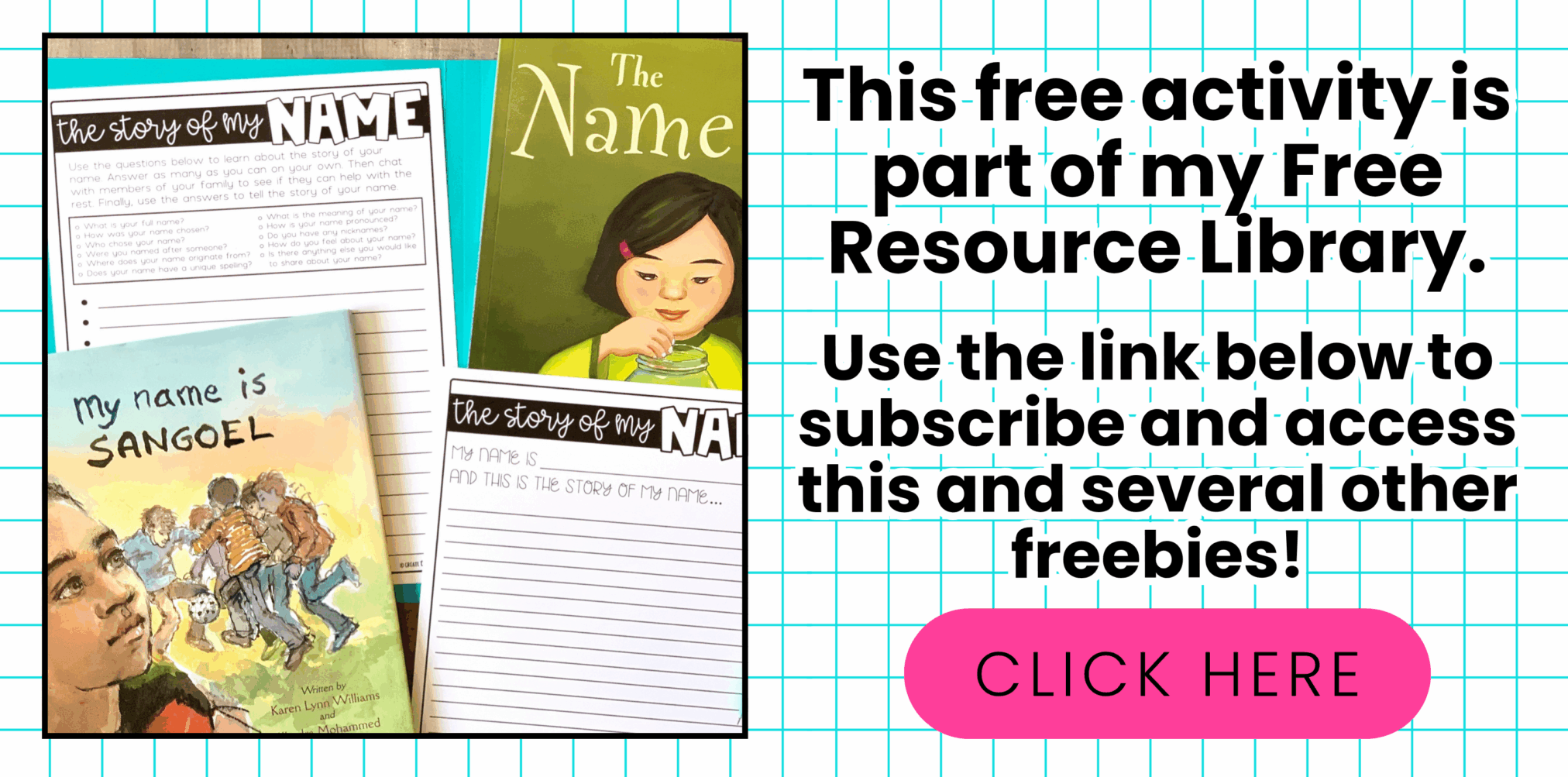 A picture book is a great way to start a conversation about names, their history, and their meanings. The Name Jar by Yangsook Choi has always been a favorite of mine. However, I also recently discovered My Name is Sangoel by Karen Lynn Williams and Khadra Mohammed. Both of these stories are beautifully written and illustrated, and show the value of learning and sharing students’ names, how they are pronounced, and the meaning behind them. They also emphasize the sense of pride that one has of his or her name, and the acceptance and celebration of those names. If you would like to learn more about these books, you can click on the pics below (affiliate links).