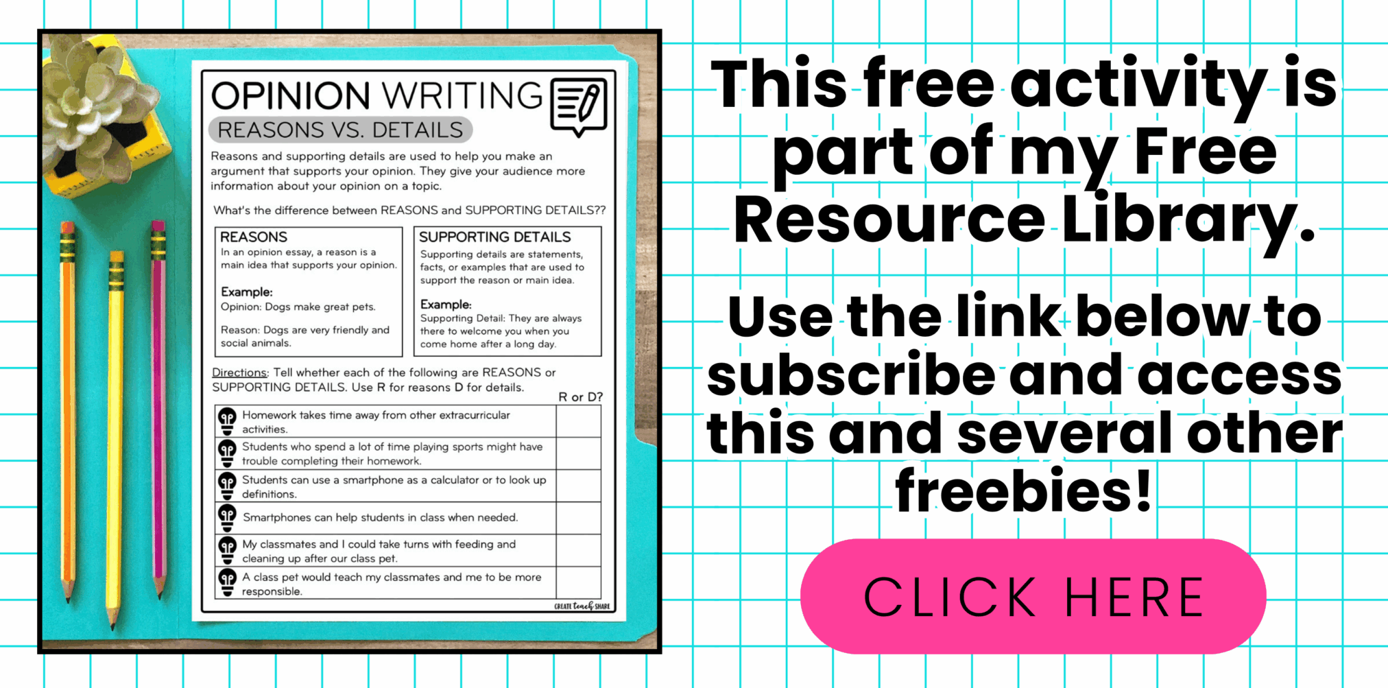 I recently had a teacher who uses my opinion writing unit, ask me how to teach students the difference between “REASONS” and “SUPPORTING DETAILS”. This is usually something that I would go over with students when they organize their ideas. But when this teacher asked, it made me realize that this was an important lesson itself. I decided to create a “BONUS” lesson to address this skill.